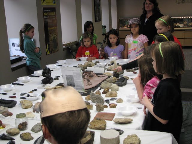I took the kids on a field trip to the Tulsa Geoscience Center a couple of weeks ago with our homeschool group. They learned about fossils, rocks and minerals and their different smells and markings, how earthquakes happen, how certain minerals and rocks glow under certain lighting, and they even got to make their own rubber bands w/ latex and vinegar. We had a great time and the people that work there are very nice and really made it fun for the kids. I am having trouble w/ Blogger uploading some of my pics and spacing them correctly, so hopefully, most of these will show: